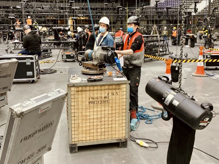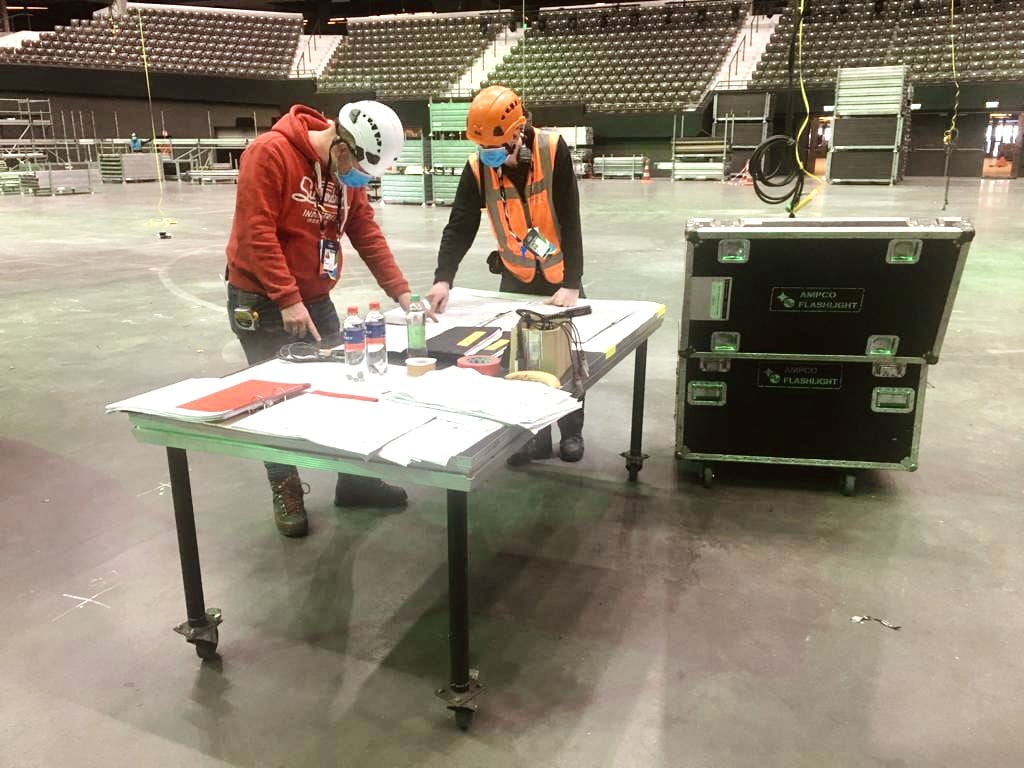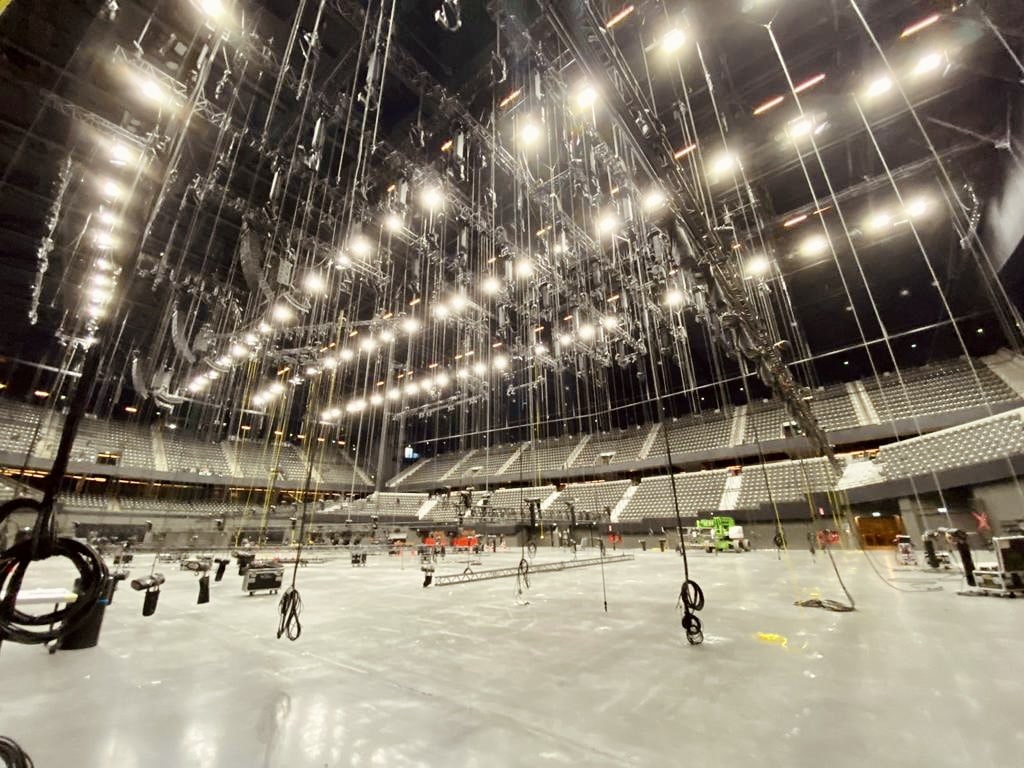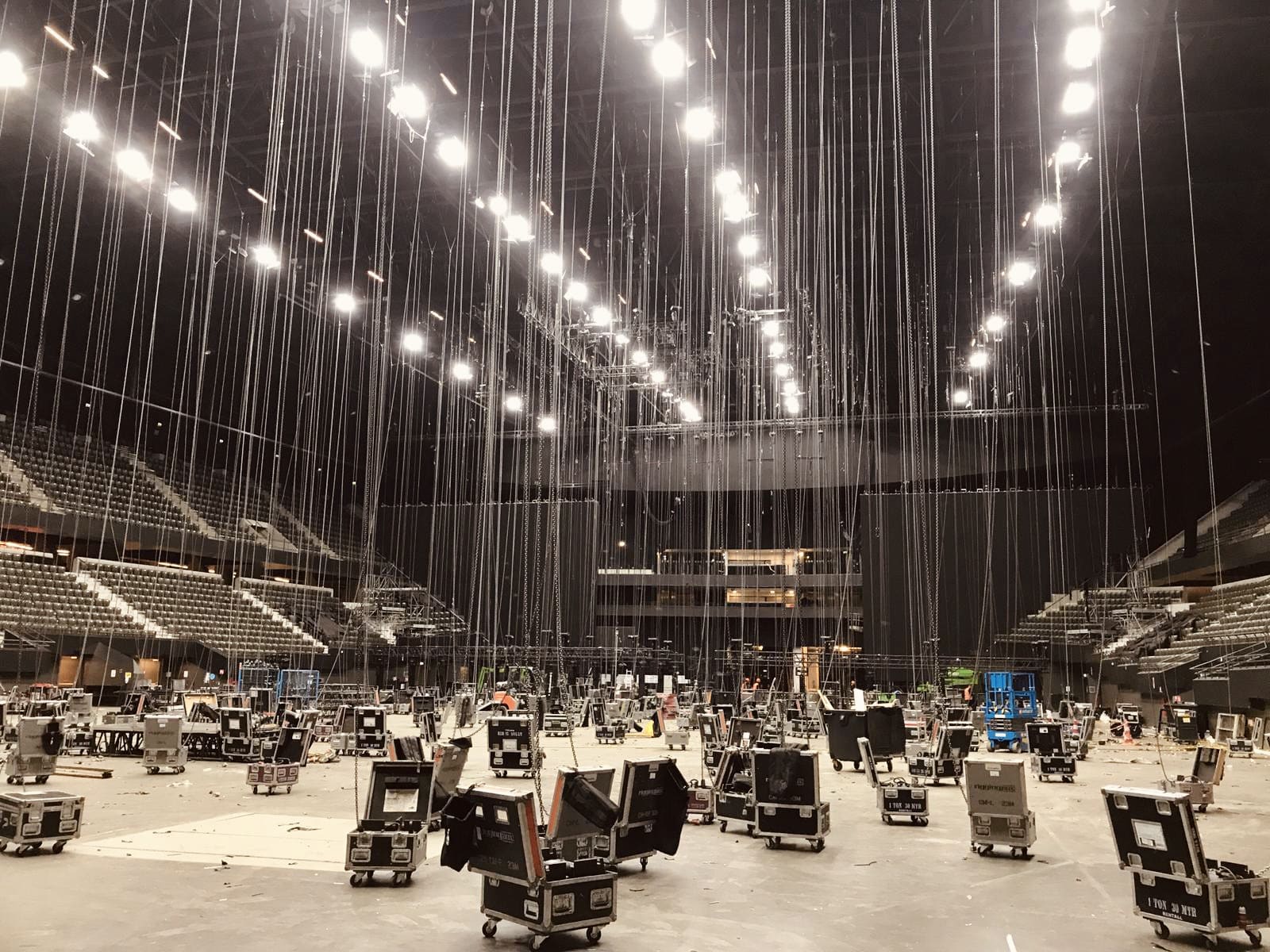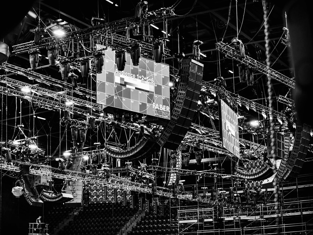 The floor is cleared but we still have enough work for our riggers. Trusses above the audience stands, adjustments, checks and assisting other technical parties.