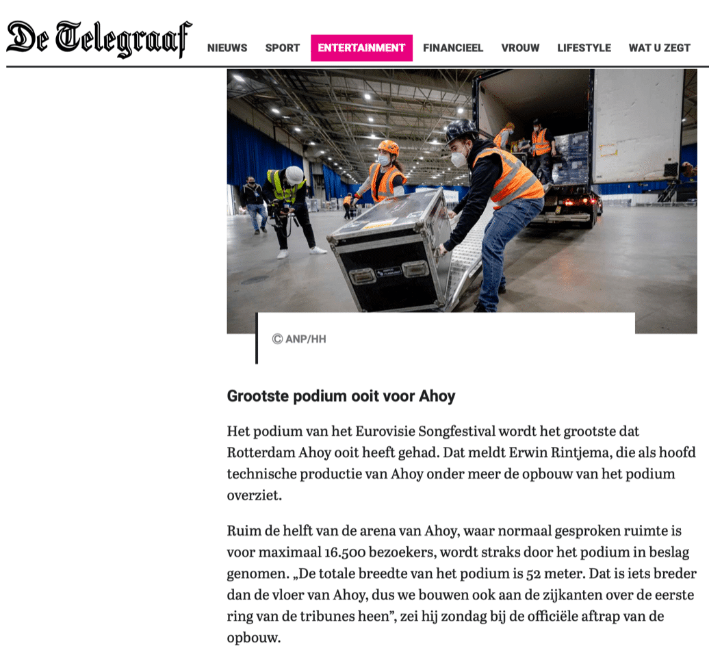 The Eurovision Song Contest is a high profile production for NOS/Avrotros, for the AHOY Venue, for the producers, for artists and for technical suppliers like us, in good hands with Head of production Erwin Rintjema. Â The load-in is extensively covered by national press!